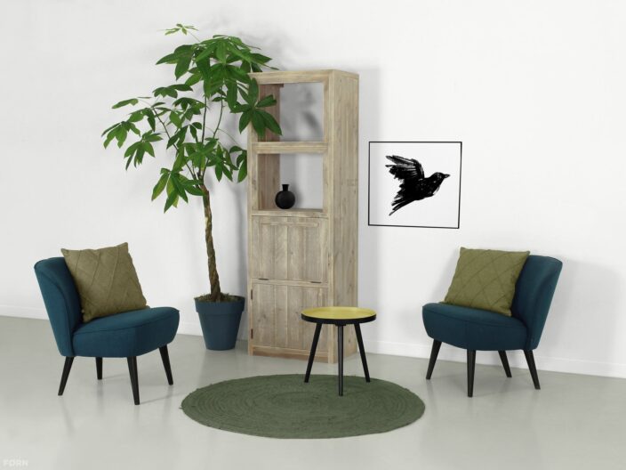 Robuuste kast Slegge heeft een deur en een klep. Achter het deurtje kunnen we een legplank plaatsen. De standaarddiepte van de steigerhouten kast met achterwand is 40 cm. De bruin/grijze houtkleur past in bijna ieder interieur zowel thuis als op kantoor of in de winkel. Andere maten? Dat kan! Toch een net iets ander model steigerhouten kast? Ook dat kan! Vul het formulier onder de tab ‘eigen idee of op maat laten maken’ in of mail ons op contact@forn.nl.